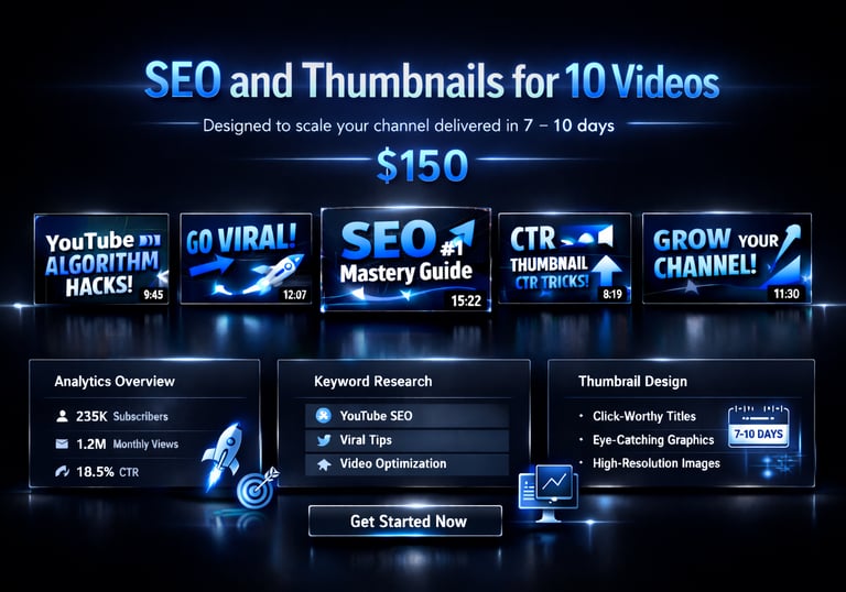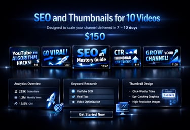 SEO and thumbnails for 10 videos, designed to scale your channel delivered in 7–10 days. 150$