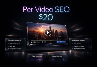Per video SEO includes titles, descriptions, tags, and keywords to improve video visibility and search ranking. $20 per video